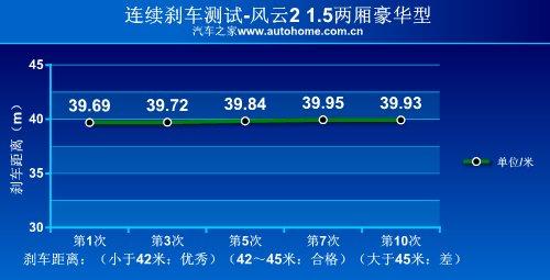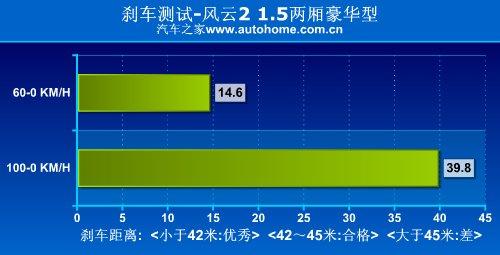 我們對(duì)風(fēng)云21.5L兩廂豪華型進(jìn)行的性能測(cè)試中顯示,從100KM/h全力制動(dòng)到車(chē)輛靜止,剎車(chē)距離為39.8米,成績(jī)非常出色;剎車(chē)踏板回饋力較大,所以在剎車(chē)時(shí)需要使用更大力氣,在日常駕駛中踏板的余量偏大,不過(guò)一旦深踩,制動(dòng)效果明顯。