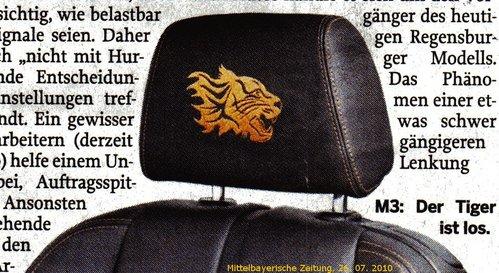 外觀方面,M3 Tiger特別版的進(jìn)氣格柵、反光鏡邊緣都使用了黑色,而車輪部分也升級(jí)為寶馬的359M系列(16輻)運(yùn)動(dòng)化鍛造黑色19英寸輪轂,配合銀色的鍍鉻排氣管。內(nèi)飾部分,M3 Tiger紀(jì)念版的內(nèi)飾為黑色真皮坐椅,對(duì)應(yīng)火焰橙的走線。