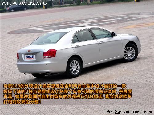 剛才說完了我對(duì)這款車的第一印象,下面我再和你說說我的第二印象:漂亮。請(qǐng)不要認(rèn)為我是帝豪的車托,因此當(dāng)你見到帝豪EC8的時(shí)候也會(huì)對(duì)這款車的優(yōu)美的外形設(shè)計(jì)感到贊嘆。特別是從尾部以45°角看的時(shí)候更會(huì)讓你覺得它的線條很優(yōu)美。此外,帝豪EC8的C柱設(shè)計(jì)的特別厚實(shí)且平緩,這樣就與后備箱很好的融合在一起。