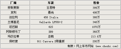 這次成都車展勞斯萊斯、賓利、法拉利、蘭博基尼等高端品牌悉數(shù)參展,為成都的消費(fèi)者帶來了其當(dāng)家車款,比如古思特、慕尚、458 Italia、Gallardo LP550-2都是上市不久的新車,邁巴赫在車展上首發(fā)了其全新一代62S,預(yù)計(jì)售價(jià)1070萬元,而保時(shí)捷也發(fā)布了911 Carrera S Porsche Carrera Cup Asia,限量發(fā)售30臺預(yù)售200萬。