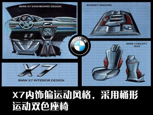 從寶馬X7的內(nèi)飾草圖可以看出偏向運(yùn)動(dòng)風(fēng)格,有棱有角的中控臺(tái)和不規(guī)則的方向盤彰顯其與眾不同。桶形賽車座椅極富現(xiàn)代感,腰部兩側(cè)支撐與座椅主體采用不同色的搭配。