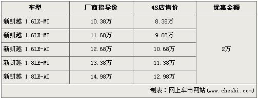 據(jù)4S店銷售人員介紹,新凱越分為1.6L與1.8L兩種排量車型,目前新凱越的1.6L全系優(yōu)惠2萬元,較上個(gè)月的優(yōu)惠降幅有所回縮。經(jīng)優(yōu)惠后,全系最低配的1.6LX-MT車型售價(jià)回升到了8.38萬元。經(jīng)優(yōu)惠后,1.8L手動(dòng)和自動(dòng)兩款車型售價(jià)也回升到了11.38萬元和12.98萬元。銷售人員還介紹,目前1.6L車型店內(nèi)無現(xiàn)車,欲購買者需交訂金2000元,下個(gè)月才可提車。