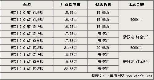 筆者從北京地區(qū)經(jīng)銷商處了解到,目前領(lǐng)翔全系優(yōu)惠幅度仍然保持在5000元。據(jù)店內(nèi)銷售人員介紹,除2.0舒適型和豪華型有部分現(xiàn)車供應(yīng)外,其他款仍需要預(yù)訂,訂金為5000元,15個工作日內(nèi)便可以交車。目前銷售的領(lǐng)翔在原來車型基礎(chǔ)上增加了2.0自動舒適與2.0手動豪華兩款車,并在配置上有一定調(diào)整。消費(fèi)者可到店內(nèi)試駕體驗,了解詳細(xì)車型情況。