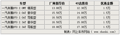 作為一汽奔騰的最新轎車車型,代號(hào)為B50的奔騰1.6L三廂新車正式上市已經(jīng)有段時(shí)間了。這款新車裝備了與速騰同款的1.6L發(fā)動(dòng)機(jī),與馬自達(dá)6睿翼采用同平臺(tái)生產(chǎn)。網(wǎng)上車市網(wǎng)站由經(jīng)銷商處得知,奔騰B50全系仍無優(yōu)惠,為預(yù)訂銷售狀態(tài),訂金1000元。而老款的B70全系車型則給出了1.5萬元的降幅。具體詳情如下: