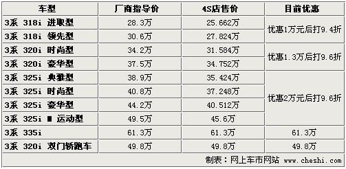 據(jù)4S店銷售人員介紹:目前寶馬3系全系車型都有一定幅度優(yōu)惠,最高降幅達到3.9萬元。雖然較之前的優(yōu)惠幅度有所減小,但是目前現(xiàn)車比較多,尤其寶馬318i系列與325i系列店內(nèi)現(xiàn)車充足,320i豪華型需預(yù)定,預(yù)訂需等1個月至2個月時間。據(jù)經(jīng)銷商介紹,寶馬318i進取型將近停產(chǎn),所以喜歡這款車的朋友盡快到店內(nèi)訂車,目前店內(nèi)有少量現(xiàn)車顏色不全。在優(yōu)惠幅度上,寶馬318i系列在優(yōu)惠1萬元后可打9.4折,寶馬320系列兩款車型在優(yōu)惠1.3萬元后可打9.6折,325系列可優(yōu)惠2萬后再打9.6折。寶馬335i和320i雙門轎跑車無任何優(yōu)惠,預(yù)定車需等4-6個月。