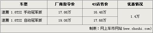 速騰冠軍版可以說是一汽大眾繼老款寶來后,又一款可以稱得上是“駕駛員之車”的車型。出自大眾先進的PQ35平臺,再加上配備缸內(nèi)直噴的1.8TSI發(fā)動機,更寬的輪胎這一切的“與眾不同”使得速騰冠軍版收到了許多膜拜性能的消費者的喜愛。據(jù)了解,速騰1.8TSI出現(xiàn)了1.4萬元的優(yōu)惠,具體價格詳情請看下表: