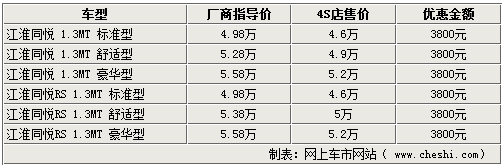 江淮的同悅及同悅RS系列車型,自上市后就吸引了眾多消費(fèi)者關(guān)注。在三廂車型銷售很長時間之后,兩廂的RS版終于進(jìn)入了北京市場開始銷售。網(wǎng)上車市網(wǎng)站由江淮轎車經(jīng)銷商處了解到,現(xiàn)在RS版以及三廂同悅車型店內(nèi)現(xiàn)車充足,購車最高可有3800元的現(xiàn)金優(yōu)惠。具體詳情如下: