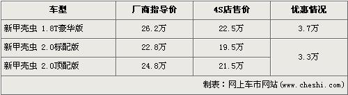 甲殼蟲是一款出自于PQ34平臺(tái)的轎車,它與我們熟知的高爾夫共平臺(tái)生產(chǎn)。不過在國(guó)內(nèi),它的“身份”卻被提升了很多,絕對(duì)的超過高爾夫的價(jià)格。正因這是一款小眾車型,所以它顯得彌足珍貴,再加上甲殼蟲圓潤(rùn)、小巧、動(dòng)感的外形,所以它給我們的印象非常親切。近日據(jù)網(wǎng)上車市價(jià)格系統(tǒng)監(jiān)測(cè)顯示,甲殼蟲出現(xiàn)了最高3.7萬元的優(yōu)惠,具體價(jià)格詳情請(qǐng)看下表:
