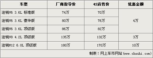 途銳是大眾首款引進我國的SUV車型,在3.6L及4.2L率先上市后,大眾為了滿足消費者的更大胃口,緊接著又推出了搭載12缸發(fā)動機的6.0L車型。隨著大排量消費稅的頒布,給9月份后入關的大排量車型帶來了一次不小的沖擊,令大排量汽車價格都上調了不少,大眾途銳6.0L頂級版也從原來158萬元的價格上調至了180元。近日據(jù)網(wǎng)上車市價格系統(tǒng)監(jiān)測顯示,大眾途銳全系的最高優(yōu)惠達到了10萬元,具體詳情請看下表: