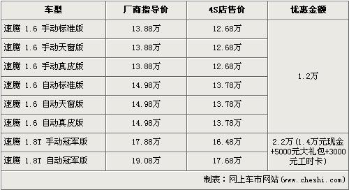 速騰是一汽大眾在緊湊型市場中的主打車型,全系車型涵蓋了1.6L、18T、2.0L三個“黃金”排量,并且在今年又會有替代2.0L車型上市的1.4T車型加入車隊中,車型列隊得到了進一步強大。近日根據(jù)網(wǎng)上車市價格系統(tǒng)監(jiān)測顯示,速騰的1.8T冠軍版出現(xiàn)了全系最高的價值2.2萬元的優(yōu)惠,具體價格詳情請看下表: