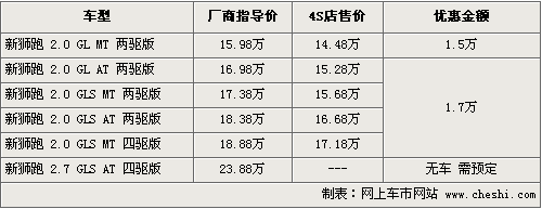 東風(fēng)悅達(dá)起亞獅跑和北京現(xiàn)代途勝屬于同平臺(tái)車(chē)型,但相比途勝,獅跑外觀更有活力,F(xiàn)售的09款獅跑在外觀和內(nèi)飾上的改變并不明顯,目前全系車(chē)型最高可以優(yōu)惠現(xiàn)金1.7萬(wàn),具體行情如下: