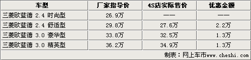歐藍(lán)德是三菱引入國(guó)內(nèi)銷售的中型SUV車型,同時(shí)歐藍(lán)德也是三菱汽車第一款采用轎車底盤形式生產(chǎn)的SUV車型。近日我們從三菱汽車官方獲悉到,全新一代的歐藍(lán)德車型將于10月13日正式上市,首次推出的車型分為2.4和3.0兩種排量,共計(jì)4款車型。與此同時(shí)根據(jù)網(wǎng)上車市價(jià)格監(jiān)測(cè)系統(tǒng)顯示,目前銷售的09款歐藍(lán)德全系均出現(xiàn)了大幅優(yōu)惠,最高降幅高達(dá)2.2萬(wàn)元。具體車型售價(jià)見下表:
