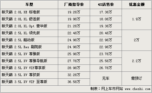 在中級車行列中,新天籟在舒適性和空間方面具有自己獨特的優(yōu)勢,尤其在車內(nèi)部座椅的乘坐感受方面,可謂獨樹一幟,新天籟在一系列升級后成為消費者選購的熱點車型之一。根據(jù)網(wǎng)上車市價格監(jiān)測系統(tǒng)顯示,新天籟為增加市場競爭力,優(yōu)惠幅度有所加大,全系最高優(yōu)惠2.2萬元。具體行情如下: