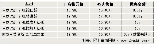 三菱戈藍(lán)2.0L新車已經(jīng)上市了,而銷售境況卻與之前的09款2.4L車型一樣沒有完全鋪開。近日網(wǎng)上車市網(wǎng)站了解到,北京銷售的09款戈藍(lán)售價(jià)已經(jīng)由前段時(shí)間的優(yōu)惠8000元提升至現(xiàn)在1萬元;而剛剛上市的2.0L戈藍(lán)全系可給出5000元的優(yōu)惠,另外部分商家還有07款的車型,直降3萬元銷售。具體詳情如下: