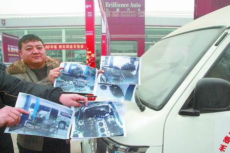 上午10時,記者趕到豐慶路與北環(huán)路交叉口,看到一輛上牌的金杯海獅商務車橫在華晨汽車銷售店門前,車旁的幾名男子出示了一沓發(fā)動機被拆開維修時的照片,該車里程表數(shù)據(jù)為12692公里。