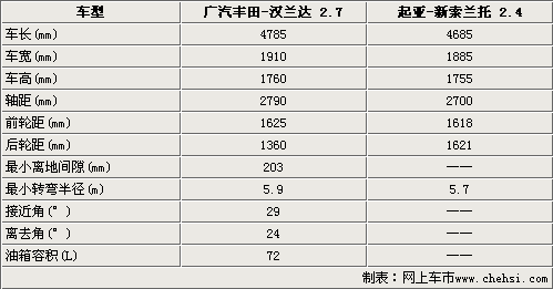 漢蘭達(dá)和新索蘭托均屬于一個(gè)級(jí)別的城市SUV。兩款車型在車身尺寸方面豐田漢蘭達(dá)在車長(zhǎng)、車寬、車高均超過(guò)了起亞新索蘭托,這一點(diǎn)保證了其內(nèi)部橫向空間及頭部空間的寬敞。在軸距方面,豐田漢蘭達(dá)比新索蘭托長(zhǎng)出了90mm,這一點(diǎn)意味著漢蘭達(dá)的腿部空間將會(huì)優(yōu)越于新索蘭托。豐田漢蘭達(dá)的前后輪距和輪胎橫截面數(shù)據(jù)都要大于新索蘭托,這表明在操控性能上漢蘭達(dá)將會(huì)略勝一籌。在轉(zhuǎn)彎半徑上面,起亞新索蘭托僅為5.7m,完全可以適應(yīng)中國(guó)地區(qū)道路窄小的特點(diǎn)。