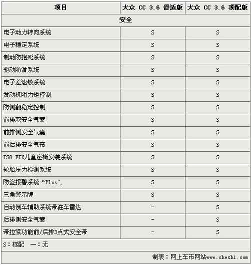 由于大眾CC 舒適版和頂配版同樣配備3.6升FSI引擎和6速DSG雙離合變速箱,所以兩款車的差價主要體現(xiàn)在車型配置方面。在外形和內(nèi)飾方面,大眾CC 舒適版和頂配版沒有本質(zhì)區(qū)別,而在安全配置和舒適配置方面,兩款車型存在一定得差異。