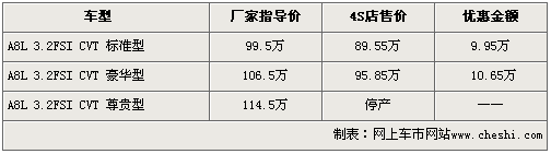 據(jù)4S店銷(xiāo)售人員介紹,奧迪A8L 3.0車(chē)型已于日前正式上市,但由于該車(chē)型為原裝進(jìn)口,所以預(yù)訂周期為6個(gè)月,且訂金為10萬(wàn)元。另?yè)?jù)該銷(xiāo)售人員表示,目前奧迪A8L 3.2車(chē)型除尊貴型停產(chǎn)外,其余兩款車(chē)型均有大幅優(yōu)惠。其中奧迪A8L 3.2優(yōu)惠幅度達(dá)10.65萬(wàn)元,而入門(mén)級(jí)車(chē)型優(yōu)惠后售價(jià)僅為89.55萬(wàn)。