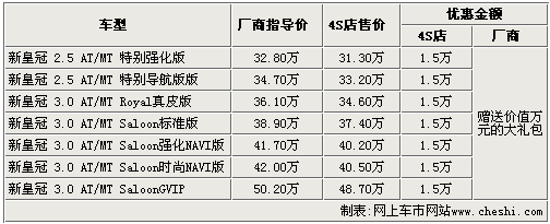 據(jù)一汽豐田銷售人員介紹:隨著新皇冠的即將上市銷售,廠商和4S店均加大了對(duì)老款皇冠的優(yōu)惠力度。目前購(gòu)買這款車的消費(fèi)者不僅可以享受到1.5萬(wàn)的現(xiàn)金優(yōu)惠,而且廠商還會(huì)隨車贈(zèng)送價(jià)值近萬(wàn)元的數(shù)碼大禮包。