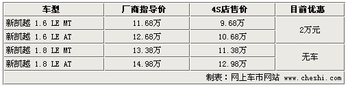 據(jù)4S店銷(xiāo)售人員介紹:目前新凱越分為1.6升和1.8升車(chē)型,但目前在售車(chē)型只有1.6升手動(dòng)豪華型和1.6升自動(dòng)豪華型,1.6升低配車(chē)型目前無(wú)車(chē),1.8升由于銷(xiāo)量極少,所以廠家不排產(chǎn),也不接受預(yù)訂。目前1.6升車(chē)型現(xiàn)車(chē)很充足,顏色有白色、銀色、紅色、黑色等,這幾種顏色車(chē)型銷(xiāo)量較好。目前新凱越最高可優(yōu)惠2.2萬(wàn)元,但店內(nèi)無(wú)裝飾贈(zèng)送。