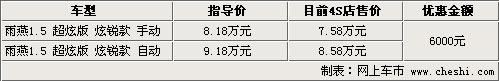 長(zhǎng)安鈴木雨燕以其圓潤(rùn)優(yōu)雅的外形,逐漸受到了消費(fèi)者的青睞,新雨燕自從上市以來(lái),其銷售情況一直比較穩(wěn)定。由于排放問(wèn)題的影響,因此1.3L雨燕在北京市場(chǎng)上已經(jīng)不再銷售。目前在北京市場(chǎng)上,購(gòu)買(mǎi)長(zhǎng)安鈴木雨燕1.5L超炫版炫銳款可以得到6000元的優(yōu)惠。具體車型詳見(jiàn)下表:
