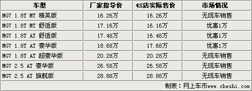 據(jù)名爵4S店銷售人員介紹,名爵MG7只有1.8T車型是店內(nèi)較為齊全的車型,2.5排量車型均需要提前預(yù)定。現(xiàn)在購買名爵MG7 1.8T車型在店內(nèi)可直接優(yōu)惠1萬元,比前一段時間的優(yōu)惠幅度有所提高,F(xiàn)在購車除了可以享受到現(xiàn)金優(yōu)惠外,還可以享受到商家贈送的價值7000元的裝飾禮包。北京地區(qū)各4S店由于訂單不同,各店銷售的現(xiàn)車顏色有所不同,消費者在購買前可以多去幾家4S店。