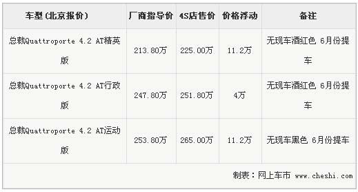 據(jù)北京地區(qū)瑪莎拉蒂展廳銷(xiāo)售人員介紹,全新Quattroporte總裁目前沒(méi)有現(xiàn)車(chē)銷(xiāo)售,但6月份會(huì)有一批現(xiàn)車(chē)抵達(dá)展廳,其中包括酒紅色的精英版,售價(jià)225萬(wàn)元;還有酒紅色的行政版,售價(jià)251.8萬(wàn)元;另外,全新Quattroporte總裁運(yùn)動(dòng)版將會(huì)有一臺(tái)黑色現(xiàn)車(chē)抵達(dá),售價(jià)265萬(wàn)元。該銷(xiāo)售人員表示,這批全新Quattroporte總裁將會(huì)在原有車(chē)型上增加更多配置,所以?xún)r(jià)格會(huì)有所提升。