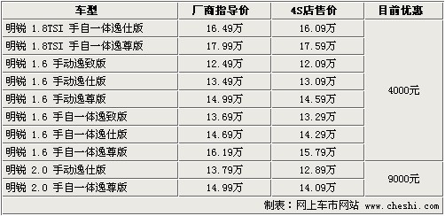 據(jù)4S店銷售人員介紹:目前明銳全系最高優(yōu)惠9000元,1.6升及1.8TSI車型優(yōu)惠減少,尤其1.8TSI車型由原來的8500元降至4000元。2.0升目前優(yōu)惠9000元,優(yōu)惠幅度很大,并且2.0升車型有現(xiàn)車,顏色包括銀色、灰色車型。1.6升車型全系現(xiàn)車少,如需預定最短等待1個半月,最長需等3個月時間。目前1.6升車型優(yōu)惠達4000元,1.8TSI的兩款車型優(yōu)惠4000元。如在店內(nèi)做裝飾還可打折,雖然折后裝飾價格仍有些偏高,但產(chǎn)品質(zhì)量可以保證。