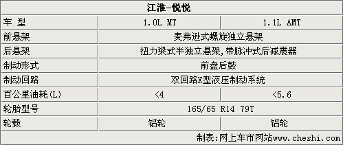 在底盤方面,江淮悅悅的前懸架采用麥弗遜式獨(dú)立懸架,后懸架為扭力梁式半獨(dú)立懸架。制動系統(tǒng)則采用前盤后鼓式,并采用雙回路X型液壓制動系統(tǒng)。另外,悅悅兩款排量的新車都采用全鋁輪轂,并采用165/65 R16尺寸的輪胎。