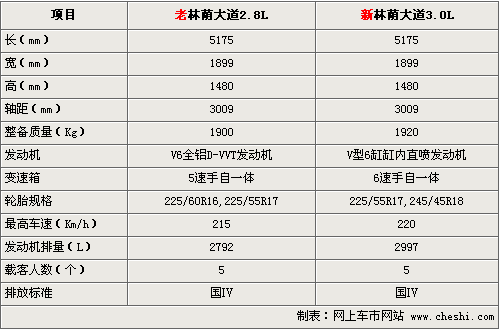 新款林蔭大道3.6L車型排量沒有提高,但整備質(zhì)量提高了25 kg。輪胎從原來(lái)的225/55R17升級(jí)到245/45R18,提高了車輛的穩(wěn)定性能。更換的6速變速器也使車輛最高車速由215公里提高到220公里。