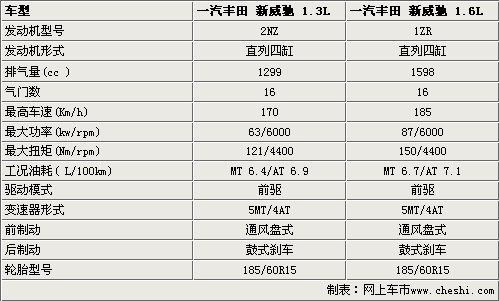 豐田新威馳將繼續(xù)搭載1.3L和1.6L兩款發(fā)動機,來滿足不同消費者的需求。這兩款發(fā)動機都是直列4缸16氣門引擎,具有可變節(jié)氣門技術,在保證強勁動力輸出的同時,又可以達到了良好的節(jié)油性能,1.6L自動擋車型的百公里油耗僅為7.1L,1.3L手動擋車型的油耗更為節(jié)省,百公里油耗不到6.4L。在動力輸出方面,1.3車型的最大功率和最大扭矩分別達到了6.3Kw和121Nm,同時1.6車型的最大動力輸出也達到了87Kw和150Nm。在同級車中絕對稱得上是出類拔萃。在變速器方面,分別裝配上了5速手動變速器和4速手自一體變速器。新威馳的制動器均為前盤后鼓式制動器。