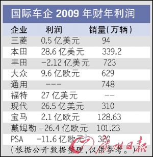 就拿現(xiàn)在全球風頭“最勁”的大眾汽車來看,2009財年的營業(yè)額超過1000億歐元,但利潤只有區(qū)區(qū)9.6億歐元,利潤率還不到1%,如果按其629萬輛的銷量來計算,每輛車的平均利潤僅有100多歐元,大眾去年全年的盈利恐怕還沒有其在中國的兩個合資企業(yè)一汽大眾、上海大眾的合計多。曾經(jīng)是全球第一賺錢車企的豐田汽車受銷量下滑和“召回門”的影響,2009財年預計出現(xiàn)2億多美元的虧損;即使是國人看來利潤豐厚的豪華車制造商戴姆勒-奔馳和寶馬,日子也不是那么滋潤。寶馬集團去年在全球售出了近130萬輛汽車,但只有區(qū)區(qū)2.1億歐元的純利潤,而戴姆勒-奔馳更是出現(xiàn)了20多億歐元的虧損。