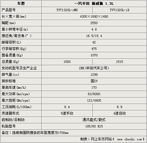 豐田改款新威馳依然由一汽生產(chǎn),同時(shí)將有6款車型推出,變速箱份為4速自動和5速手動。排量上分為1.3升與1.6升。長4300mm×寬1690mm×高1490mm的車身尺寸也與老款車型保持一致,完全可以滿足年輕人在日常中的使用,并且新款車型提供了防擦條選裝件,可增加個性與實(shí)用性。