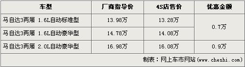 馬自達3兩廂是一汽馬自達以進口方式引入的車型,售價為13.98—16.98萬元。馬自達3兩廂車型在上市時憑借出色的動力性能以及動感飽滿時尚的外形贏得了廣大消費者的青睞,近日據(jù)網(wǎng)上車市網(wǎng)站價格監(jiān)測系統(tǒng)顯示:馬自達3兩廂全系最高優(yōu)惠9000元,具體車型見下表:
