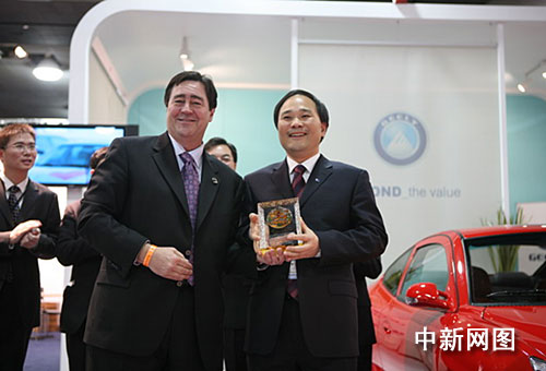 中新網(wǎng)1月16日電 當?shù)貢r間1月14日下午,2008底特律車展組委會主席卡爾•加里亞拉來到吉利展臺,將本次展會一份非常特殊的大獎授予吉利集團董事長李書福,表彰他多年來領(lǐng)導吉利汽車不斷進取、不斷進步所取得的非凡成就。