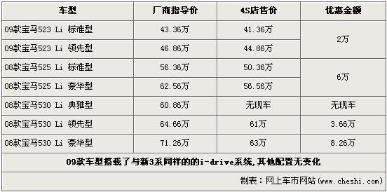 據(jù)4S店銷售人員介紹,寶馬5系各款車型優(yōu)惠金額均不同,最高優(yōu)惠達(dá)到了8.26萬。目前在售的523 Li車型全部為09款,其與新3系搭載了同樣的i-drive系統(tǒng),經(jīng)2萬元優(yōu)惠后,09款523 Li標(biāo)準(zhǔn)型與領(lǐng)先型售價分為降價為41.36萬元和44.86萬元。525 Li標(biāo)準(zhǔn)型和豪華型經(jīng)6萬元優(yōu)惠后售價降為50.36萬元和56.56萬元。530 Li豪華型的優(yōu)惠金額達(dá)到了全系最高的8.26萬元,售價也降到了71.26萬元。