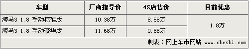 海馬系列車型一直有經(jīng)濟(jì)、省油等鮮明的特點(diǎn)。而在海馬3等一批車型上,則融合了更多時(shí)尚和運(yùn)動(dòng)的元素,同時(shí)全車在設(shè)計(jì)、配置以及燃油性上均有提升。根據(jù)網(wǎng)上車市價(jià)格監(jiān)測(cè)系統(tǒng)顯示,目前海馬3在售的兩款車型最高優(yōu)惠達(dá)到了1.8萬元,具體車型以及價(jià)格如下: