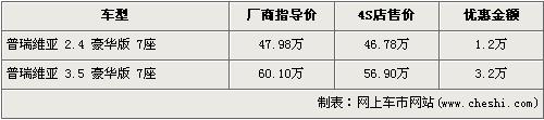 對(duì)中國(guó)的消費(fèi)者來(lái)說(shuō),豐田普瑞維亞是一款耳熟能詳?shù)能?chē)型,通常人們都成為大霸王。這款車(chē)在空間、舒適度和配置等方面在同級(jí)別車(chē)型中擁有比較明顯的優(yōu)勢(shì),但價(jià)格卻一直居高不下。根據(jù)網(wǎng)上車(chē)市價(jià)格監(jiān)測(cè)系統(tǒng)顯示,目前普瑞維亞出現(xiàn)了最高3.2萬(wàn)元的優(yōu)惠,具體車(chē)型已經(jīng)價(jià)格如下: