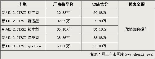 奧迪新A4L自從廣州車展發(fā)布以來受到眾多消費者關(guān)注,全新的淚眼設(shè)計外觀再加上多項高科技安全配置使這款車在同級別車中更凸顯出奧迪一貫的品質(zhì)。記者最近從北京地區(qū)奧迪經(jīng)銷商處了解,目前新A4L新車取消了加價提車,具體車型價格如下: