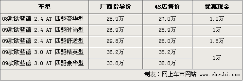 歐藍(lán)德是三菱引入國(guó)內(nèi)銷售的中型SUV車(chē)型,經(jīng)過(guò)09款小改款后,新款在外觀上增加了冷銀色換擋裝飾板,鍍鉻門(mén)內(nèi)把手,鍍鉻側(cè)窗裝飾物,鍍鉻尾門(mén)裝飾條等等,同時(shí)內(nèi)飾也有局部的變動(dòng)和提升。根據(jù)網(wǎng)上車(chē)市價(jià)格監(jiān)測(cè)系統(tǒng)顯示,目前歐藍(lán)德新老款車(chē)的優(yōu)惠幅度均在2萬(wàn)元內(nèi),具體車(chē)型以及價(jià)格如下: