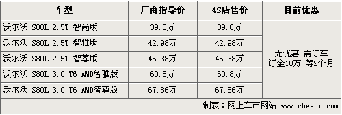 S80L加長版是沃爾沃專門為中國市場量身打造的一款全新豪華車,軸距加長140毫米,配置更加豪華,以滿足中國消費(fèi)者的需求。國產(chǎn)加長版包括了2.5T和3.0兩個排量共5款車型。目前北京地區(qū)加長版車型現(xiàn)車緊缺,均需要提前預(yù)訂,具體行情如下: