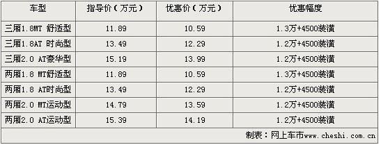 經(jīng)銷商表示,購買?怂谷弟囆统丝梢缘玫1.3萬元的現(xiàn)金優(yōu)惠外,還可以得到價值4500元汽車裝飾。優(yōu)惠后的?怂箖蓭1.8MT 舒適型售價僅為10.59萬。銷售人員還表示,目前?怂勾蟛糠周囆偷挠鞋F(xiàn)車,顏色方面可選余地不大。