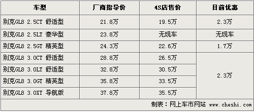 別克GL8是MPV市場一款非常受歡迎的車型,成為公司和商務(wù)用車的主要選擇對(duì)象,被稱為“陸上公務(wù)艙”。根據(jù)網(wǎng)上車市價(jià)格監(jiān)測系統(tǒng)顯示,目前這款車的優(yōu)惠幅度在原來2萬元基礎(chǔ)上增加到了2.3萬元,具體車型以及價(jià)格如下: