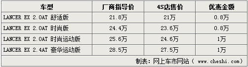 以純進(jìn)口車身份銷售的三菱LANCER EX上市后,憑借上佳的質(zhì)量及性能受到消費(fèi)者喜愛。據(jù)網(wǎng)上車市網(wǎng)站得到的消息,近期北京各家進(jìn)口三菱經(jīng)銷商處已經(jīng)出現(xiàn)了價(jià)格松動(dòng),除低配車型優(yōu)惠仍為8000元外,2.0L高配車型以及頂配的2.4L豪華運(yùn)動(dòng)版車型均可給出10000元優(yōu)惠。詳情如下: