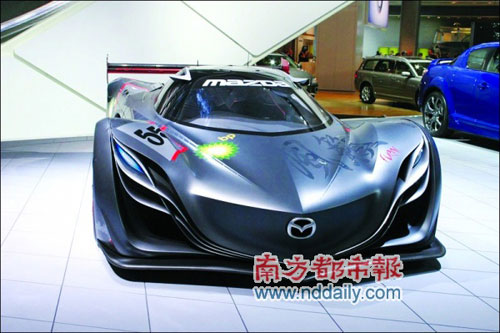 ●馬自達(dá)Furai概念車:這款車搭載一臺中置的馬自達(dá)三轉(zhuǎn)子20B引擎,由于使用E100乙醇燃料,其功率達(dá)到450馬力。Furai在原有賽車規(guī)格車身不變的情況下可以達(dá)到原來下壓力的80%.Furai利用獨特的吸氣模式將空氣導(dǎo)入進(jìn)氣口,從而大大提高氣流的利用率。