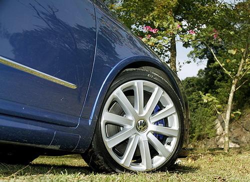 有別于其它改裝廠慣用紅色代表性能基因,大眾的運動R家族則選用藍色作為代表。除了車身烤漆外,靛藍色也成為妝點輪圈的重要元素。R36腳踏尺碼235/40 R18的大腳扁平跑胎,搭配造型簡約的10幅Omanty鋁圈;其后則是R家族獨有的藍色剎車卡箝,隱喻強大的制動性能。