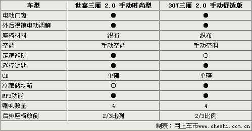 由于兩款車型都是2.0的低配車型,所以在配置方面沒(méi)有太突出的地方。電動(dòng)門窗、外后鏡電動(dòng)調(diào)節(jié)、遙控鑰匙和后排座椅放倒功能都是它們的標(biāo)配。但是兩款車型還是各自都有各自的特點(diǎn),雪鐵龍世嘉三廂配備了定速巡航,可以大大減少駕駛員長(zhǎng)途駕駛的疲勞。標(biāo)致307則配備了具有冷藏儲(chǔ)物功能的手套箱。這些配置在同級(jí)別同價(jià)位的車型中都是很少見(jiàn)到的。