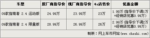 據(jù)經(jīng)銷商銷售人員介紹,09款指南者的官方廠商指導(dǎo)價(jià)下調(diào),運(yùn)動(dòng)版的售價(jià)從24.99萬元下降到了23.99萬元,限量版的售價(jià)從28.99萬元下降到了26.99萬元,并且經(jīng)銷商處還有優(yōu)惠,最高優(yōu)惠達(dá)到了2.99萬元。09款指南者運(yùn)動(dòng)版與限量版經(jīng)優(yōu)惠后,售價(jià)分別降為了23萬元和26萬元。銷售人員還介紹,指南者現(xiàn)車店內(nèi)比較緊張,錯(cuò)過這批現(xiàn)車的消費(fèi)者需交1萬元現(xiàn)金,下個(gè)月才可提車。