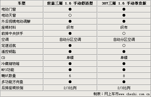 由于兩款車型都是1.6的高配車型,多以在配置方面比較全面。電動門窗、外后鏡電動調(diào)節(jié)、遙控鑰匙和后排座椅放倒功能都是它們的標(biāo)配。不僅這樣,它們還配備了一些中高級轎車才配備的冷藏功能手套箱和自動雙區(qū)空調(diào)。但是仔細(xì)看下來各兩款車型還是各自都有各自的特點(diǎn),雪鐵龍世嘉三廂配備了定速巡航,可以大大減少駕駛員長途駕駛的疲勞。標(biāo)致307則配備了電動天窗。在音響方面,307的8揚(yáng)聲器可以讓乘客更好的體會到音樂的樂趣。兩款車型都配備了方向盤音響調(diào)節(jié)功能。