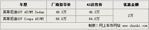 筆者從英菲尼迪北京地區(qū)經(jīng)銷商處了解到,目前英菲尼迪G37銷售的車型包括四門版和兩門版車型,售價為48.3萬和66萬,F(xiàn)在消費(fèi)者購車的話可以優(yōu)惠2萬元的現(xiàn)金,優(yōu)惠后售價為46.3萬元。這款車有銀色、黑色、紅色、白色/藍(lán)色等可提供給消費(fèi)者選擇,購車的消費(fèi)者可到店具體咨詢。